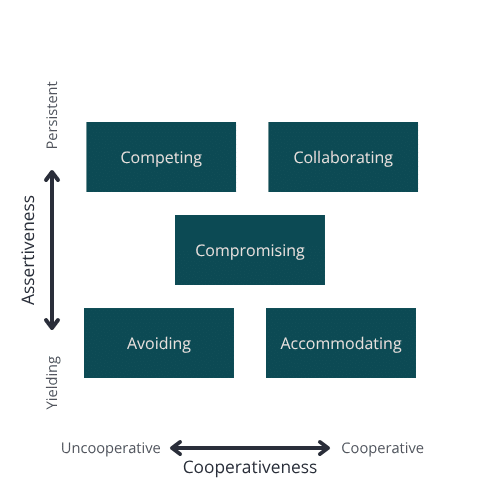 The five styles are mapped along two axes: assertiveness (yielding vs persistent) and cooperativeness (uncooperative vs cooperative):